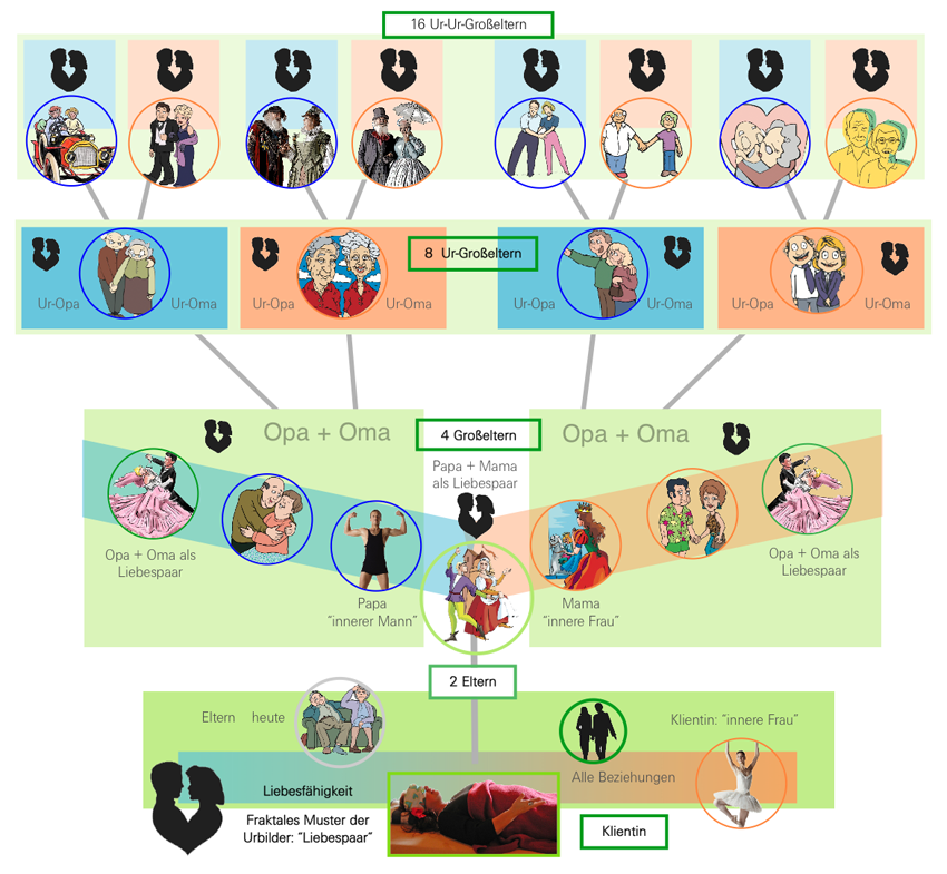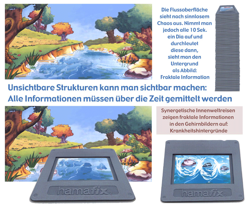 aufzudecken. Fraktale Muster gibt es überall in der Natur, aber auch im Kollektiv - also Gruppen von Menschen. Diese fraktalen Muster bilden Strukturen. Auch das Gehirn ist so aufgebaut. So müssen wir ihm nicht sagen, wo es z.B Lernerfahrungen abspeichern soll, sondern das Gehirn bildet diese neuronale Strukturen von selbst. Es arbeitet synergetisch mit dem Prinzip “Selbstorganisation”. In diesen neuronalen Strukturen des Gehirns (Neurowelt) haben wir sehr wichtige “innere Bilder” gefunden, die immer wieder auftauchten. Wir nennen sie Urbilder. Sie repräsentieren Symbolkräfte des Menschen - also gestaltbildende Kräfte, die bis zur Körperebene wirken. Diese Urbilder sind evolutionär entstanden, beschreiben also die Grundkräfte - die Basisanweisungen der Software des Menschen. Alle Muster in der Natur entsehen aus 6-8 Faktoren (Kräfte). In der inneren Bilderwelt gilt dieses Gesetz ebenfalls: 6-8 Faktoren bilden Muster, die ein Symptom beschreiben und sich neuronal materialisiert haben. Man kann diese nicht wegdenken - nur wegdrücken, verdrängen, wegklopfen usw. Dann sind sie immer noch da, aber nicht mehr dem direkten Bewusstsein zugänglich. Sie sind aber immer noch im Unterbewusstsein vorhanden und wirken! |